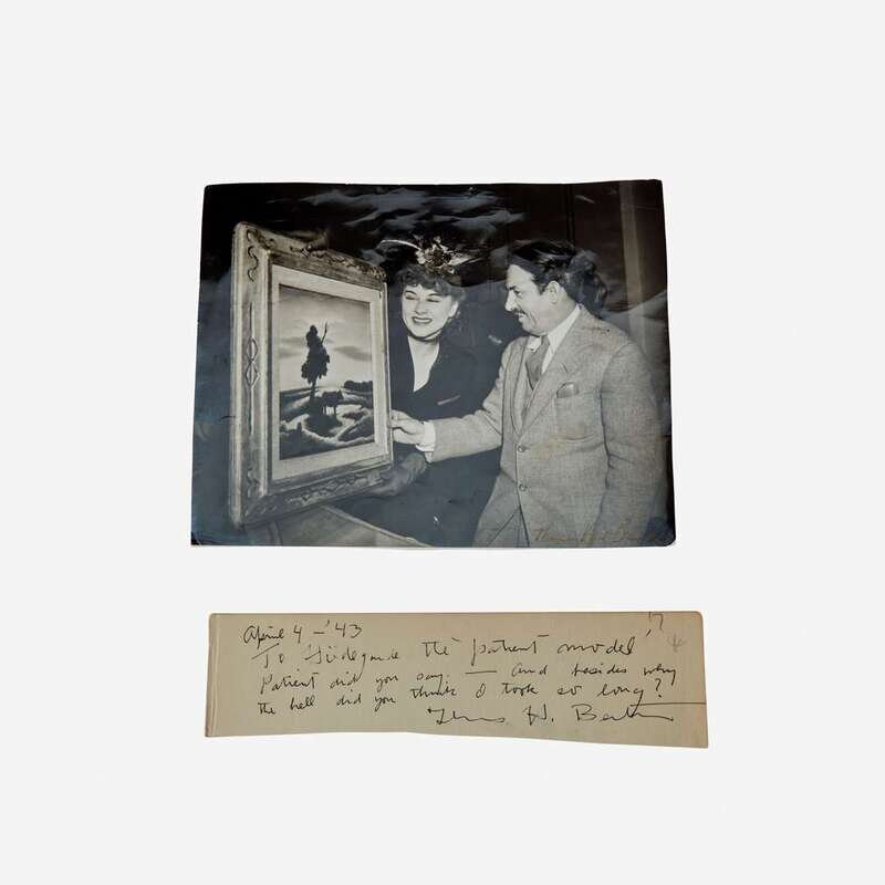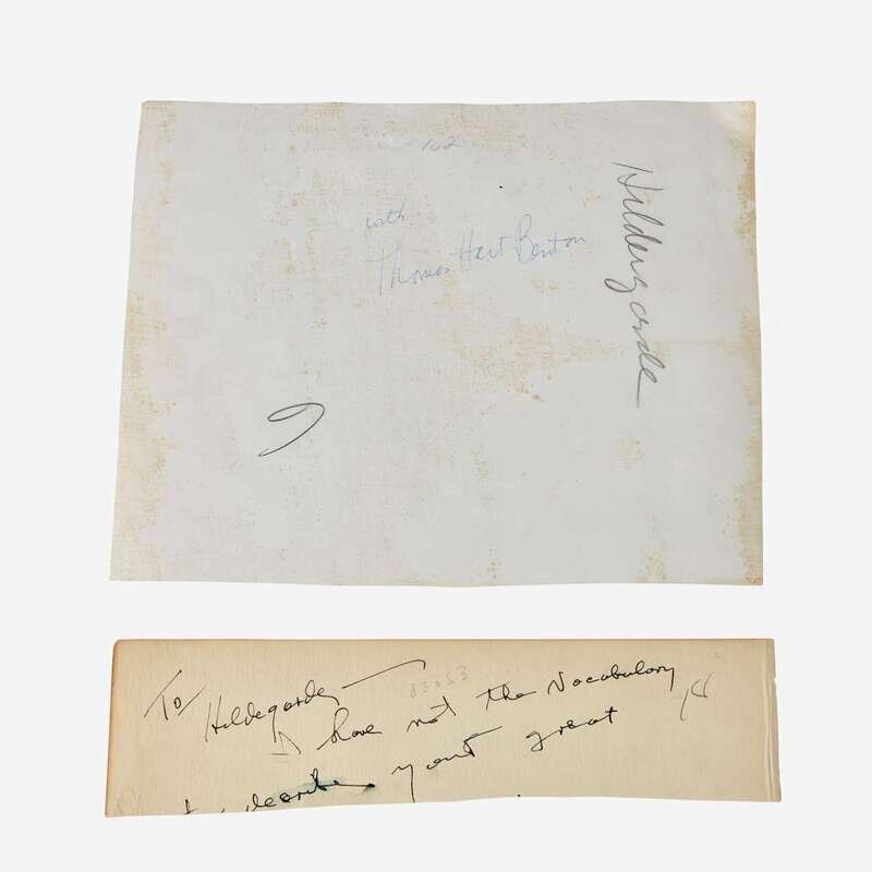 Autograph note, signed by Benton, and dated April 4, 1943: "To Hildegard the 'Patient Model' Patient did you say. --And besides why the hell did you think I took so long? Thomas H. Benton". The note is written on the top portion of a once larger leaf, now trimmed down to approximately 2 1/2 x 9 1/2 in. Together with a gelatin silver print of American singer Hildegarde Loretta Sell (1906-2005) and American painter Thomas Hart Benton, looking at a painting of Benton's; trimmed; approximately 7 1/2 x 9 1/2 in. (190 x 241 mm).