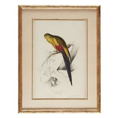 No place, 1831. Hand-colored lithograph; from Lear's "Illustrations of the Family of Psittacidae, or Parrots". Printed by C. Hullmandel. 21 1/2 x 14 1/2 in. (546 x 368 mm). Scattered spotting, two short closed tears at bottom edge. In frame.