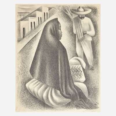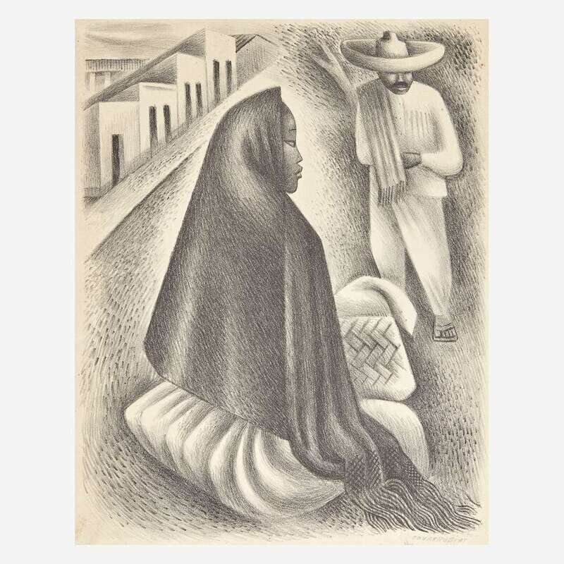 Circa 1940. Lithograph. Signed by Covarrubias in pencil, bottom right. Slightly toned; scattered spotting at recto edges, and on verso. Print: approximately 12 7/8 x 10 1/4 in. (327 x 260 mm); mat: 20 x 15 7/8 in. (508 x 403 mm). Mounted along edges and in mat.