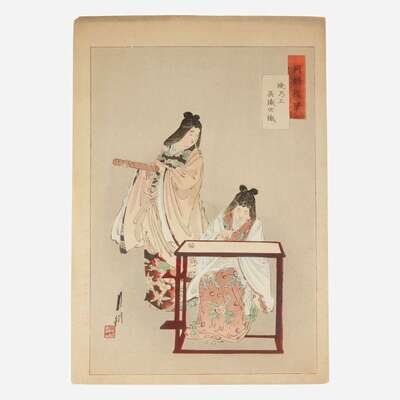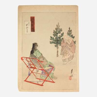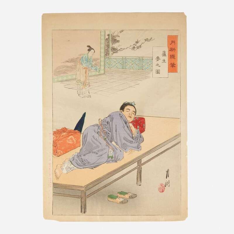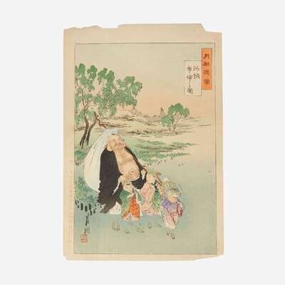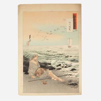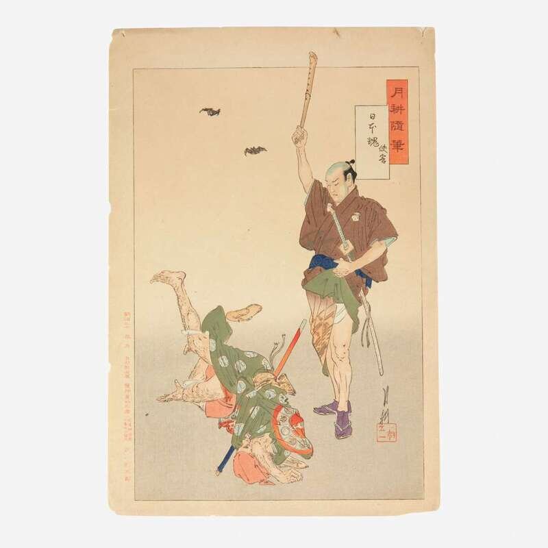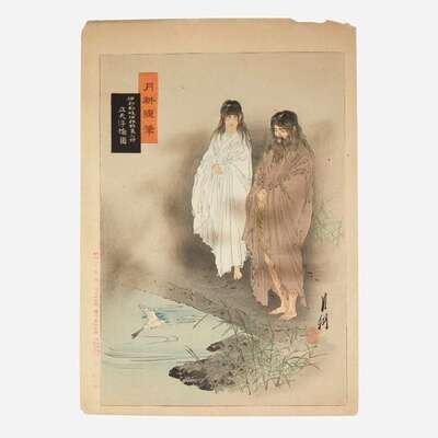 Circa late nineteenth-century. Color woodblock prints. Comprising eight prints from Gekko's "Zuihitsu"("Essays"). Each approximately 14 1/2 x 10 in. (368 x 254 mm). Each hinge-mounted and in mat.