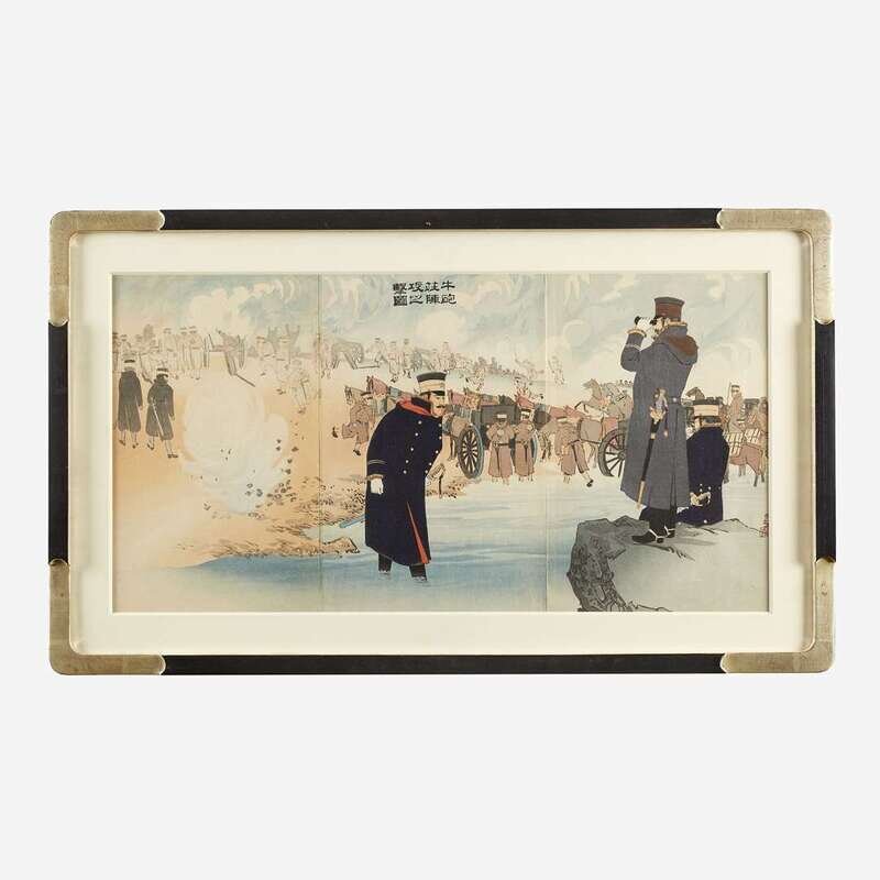 Circa 1895. Color woodcut, oban triptych. Print:13 3/4 x 26 3/4 in. (346 x 692 mm) (sight). In mat, unexamined out of frame, 18 5/8 x 32 1/2 in. (473 x 825 mm).