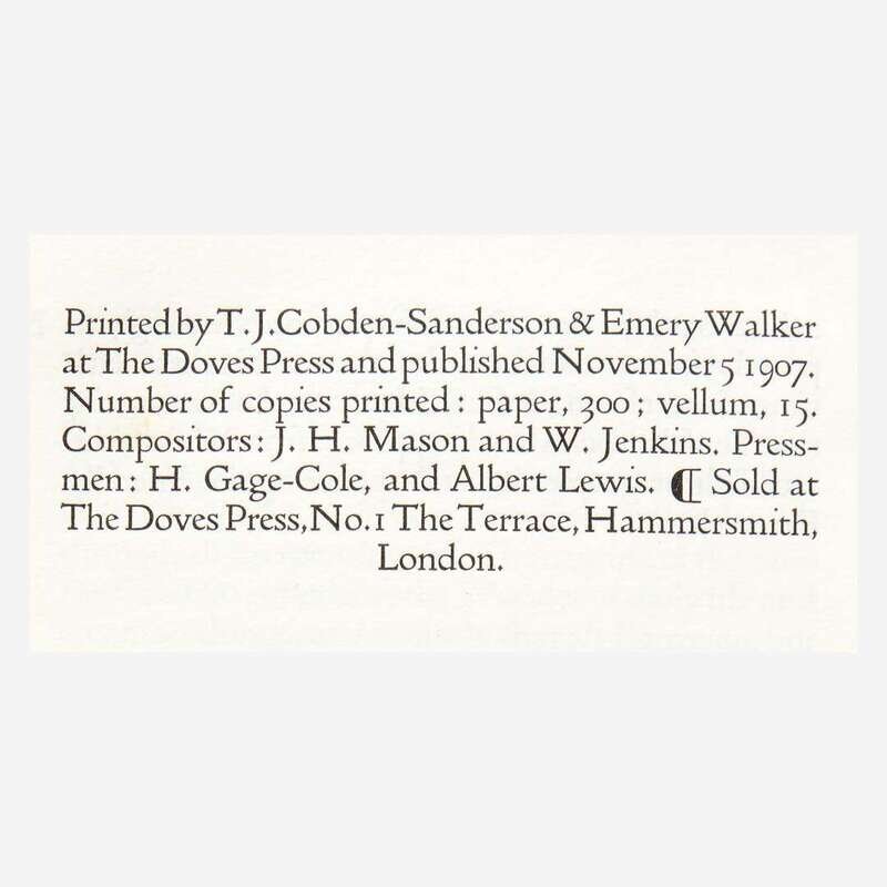(London: The Doves Press, 1907). Copy number one of numbered 300 copies on paper. 8vo. 341 pp. Text printed in black; initials and shoulder notes (chapter and book titles) printed in red. Original full limp vellum, stamped in gilt, very lightly worn; all edges trimmed; by The Doves Bindery; old calligraphic ownership label tipped in at front; with the book-plate of Scottish-American businessman George Allison Armour on front paste-down; in beige cloth slip case and chemise.