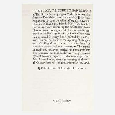 (Hammersmith: The Doves Press), 1915. First and limited edition, one of 155 copies on paper. 8vo. 301 pp. Printed in red and black. Original full limp vellum, stamped in gilt, lightly worn; top edge trimmed, other edges untrimmed; by The Doves Bindery.