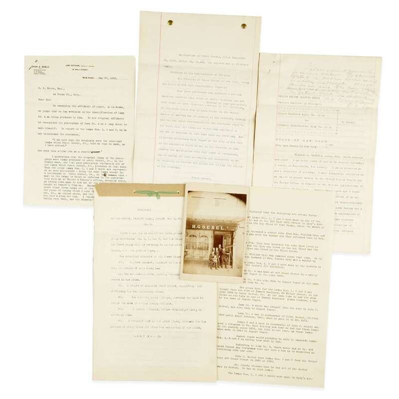 New York, 1881-1893. Including: 1. Goebel, Henry Typed Document with Original Drawing New York, September 8, 1881-December 30, 1881. 12 leaves. Patent application for Henry Goebel for "a new improved electric lamp". Including one page of drawings by Goebel illustrating his design. The patent was denied twice. 2. Typed Document No place, no date. 11 leaves. Memoranda, "On the Goebel, Exhibit Lamps...", with descriptions of four lamps and their design, presumably used as evidence in one of the patent cases. 3. Typed Document No place, no date. 1 1/4 leaves. Document listing a timeline of events relating to Goebel's lamps. 4. Typed Document New York, February 28, 1893. 9 leaves. Sworn deposition of William B. Vansize, Patent Attorney of New York and former telegraph operator, for the case "Edison Electric Light Co. et al vs. Columbia Incandescent Lamp Co. et al", refuting claims made by Goebel as to the function and creation of his lamps. With an autograph note by Richard N. Dyer, legal counsel for Edison Electric Light Co, at head of first page. 5. Typed Letter, signed New York, May 27, 1893. 2 leaves. 4to. Letter from the law firm Dyer & Seely to S.B. Eaton, General Consul for Edison Electric Light Co., discussing the affidavit of August Heger, glass blower at the American Electric Light Company. Heger was a colleague and acquaintance of Henry Goebel, who made carbon filaments at that time for American Electric. 6. Cabinet card depicting Goebel's storefront on Grand Street in Manhattan with family members posing with a telescope. Presumably signed by Henry Goebel on verso: "Prop/of/ Henry Goebel Sr. 6 1/2 x 4 1/4 in. (165 x 107 mm).