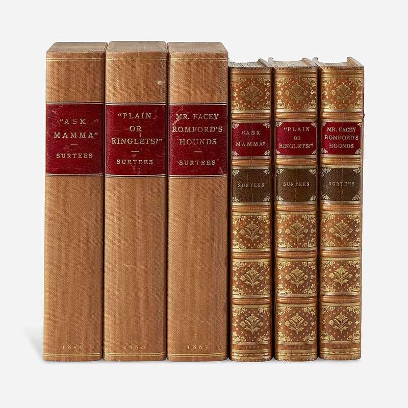 "Ask Mamma;" or, The Richest Commoner in England London: Bradbury and Evans, 1858. First edition in book form. 8vo. (xii), 412 pp. Illustrated with color frontispiece, 12 color plates, and numerous in-text illustrations by John Leech. Full polished tan calf, decoratively stamped in gilt, red and green morocco spine labels, front and rear joints dry; all edges gilt; gilt dentelles; by Riviere & Son; scattered spotting, light offsetting from plates onto text; in slip case and chemise. Together with: "Plain or Ringlets?" London: Bradbury and Evans, 1860. First edition in book form. 8vo. (x), 406 pp. Illustrated with color frontispiece, 12 color plates, and numerous in-text illustrations by John Leech. Bound as above, joints dry; scattered spotting, light offsetting from plates onto text; in slip case and chemise. Together with: Mr. Facey Romford's Hounds London: Bradbury and Evans, 1865. First edition in book form. 8vo. (viii), 391 pp. Illustrated with color frontispiece, 23 color plates, and numerous in-text illustrations by John Leech and Hablot K. Browne. Bound as above, joints dry, front board scuffed, top rear corner slightly worn; old catalogue clipping mounted on verso of front free endpaper, scattered light spotting, light offsetting from plates onto text; in slip case and chemise.
