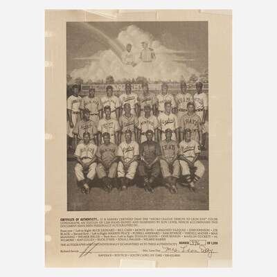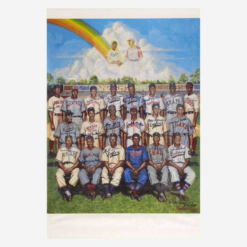 1995. Color lithographic poster. #396 of 1,200 numbered copies, signed by artist Ron Lewis at bottom, as well as 20 Negro League baseball stars. Includes COA, signed by Mrs. Leon Day and Richard Savoia. Print: approximately 30 x 24 1/4 in. (762 x 615 mm) (sight). Unexamined out of frame, 36 1/4 x 24 1/4 (920 x 615 mm).