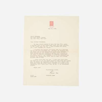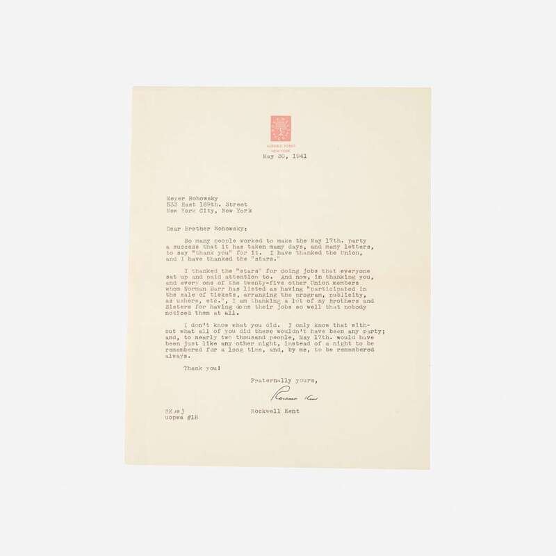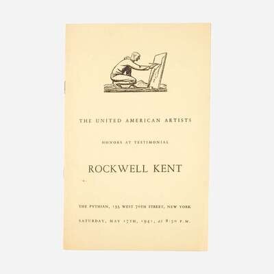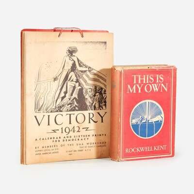 This Is My Own New York: Duell, Sloan and Pearce, (1940). First edition. 8vo. 393 pp. Signed by Kent on front free endpaper. Publisher's oatmeal cloth, stamped in blue; top edge stained black, faded, fore-edge untrimmed; dust-jacket chipped and with a few closed tears, spine darkened. From the library of WPA artist and muralist Meyers Rohowsky (1900-1974), who was a friend and colleague of Kent's, as well as Louise Nevelson, Louis Lozowick, Harry Bertoia, etc. Included in this lot is a Typed Letter, signed, by Kent, on his Ausable Forks letterhead, dated May 30, 1941, to Rohowsky, thanking him for taking part in an event honoring Kent two weeks earlier. Also included is the 8-page program from The United American Artists Honor at Testimonial, honoring Kent, May 17, 1941. Lastly, a rare calendar, "Victory 1942", featuring "sixteen prints for democracy" (Kent illustrated the cover and Rohowsky a page in this calendar).