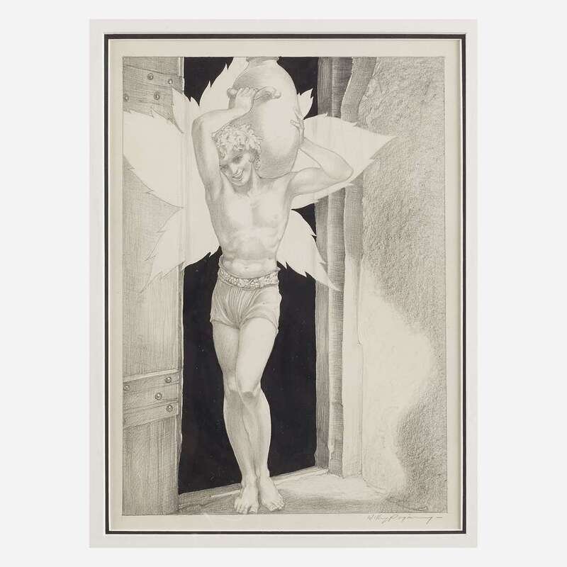 No place, no date (ca. 1942). Original graphite drawing, with pen and ink. Signed by Pogany, bottom right. Approximately 12 5/8 x 9 in. (320 x 228 mm) (sight). In mat. Together with: Rubaiyat of Omar Khayyam Philadelphia: David McKay Co., (1942). 8vo. 101 pp. Translated by Edward Fitzgerald. Illustrated by Willy Pogany. Three-quarter blue morocco, stamped in gilt, over patterned paper-covered boards, slight worn and faded; gift inscription on front free endpaper. The above illustration faces p. 59 in this volume.