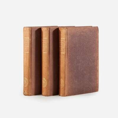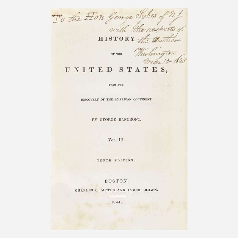 Boston: Charles C. Little and James Brown, 1844. In three volumes. 8vo. Tenth edition. Each volume inscribed by Bancroft on title-page to United States Representative George Sykes: "To the Hon George Sykes of NJ/with the respects of the author/Washington/Mar 10-1845". Each volume illustrated with an engraved frontispiece. Publisher's brown cloth, stamped in gilt, boards and extremities faded and soiled; all edges trimmed; endpapers and frontispieces foxed; scattered light foxing to text.