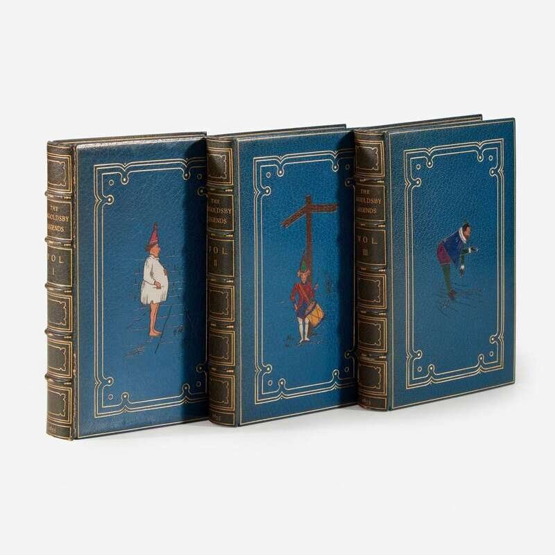 London: Richard Bentley, 1855. In three volumes. Tenth edition. 8vo. Each volume illustrated with an engraved frontispiece, vignette title-page, and numerous plates. Full blue crushed levant, stamped in gilt, multicolor leather onlay depicting different characters from the stories, spines darkened, front hinge of volume one slightly worn; all edges gilt; marbled endpapers; by Bayntun; original navy blue cloth covers bound in at rear of each volume; prelims in each volume lightly foxed.