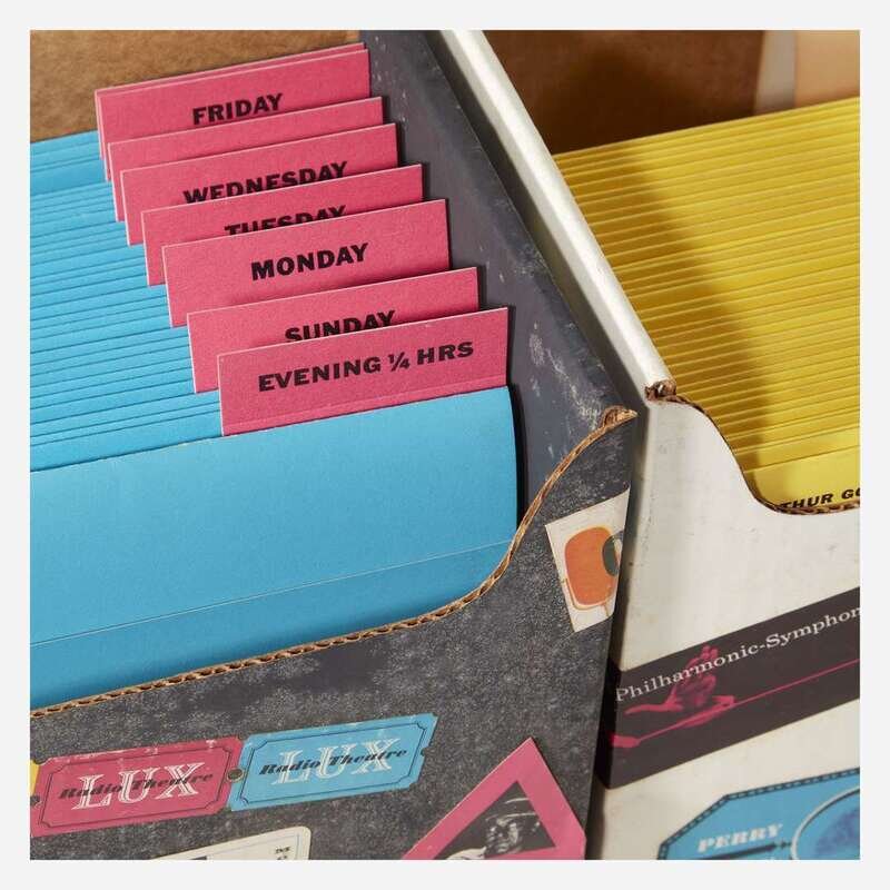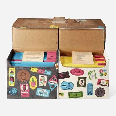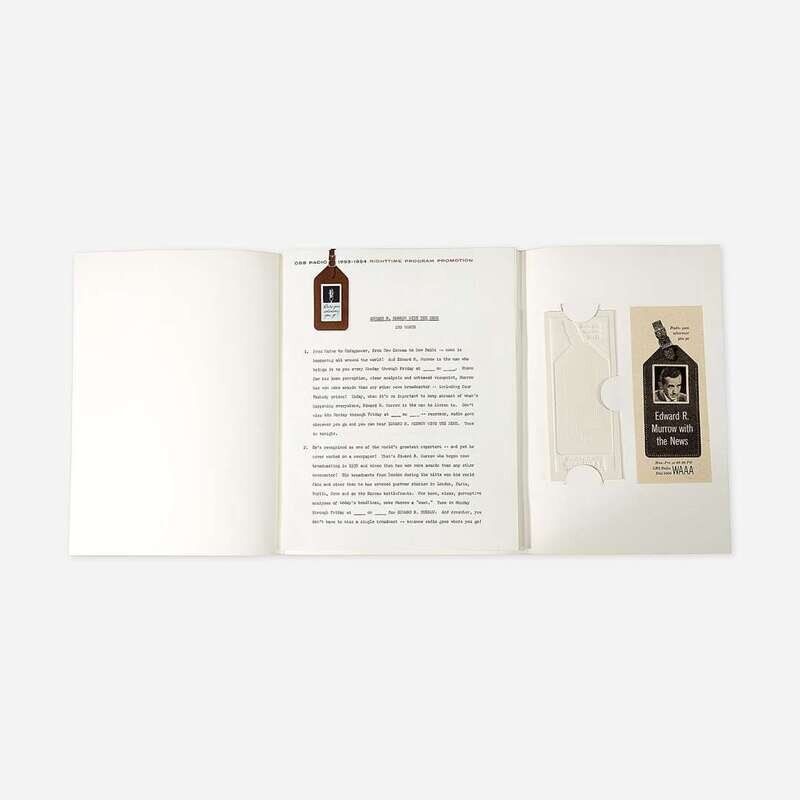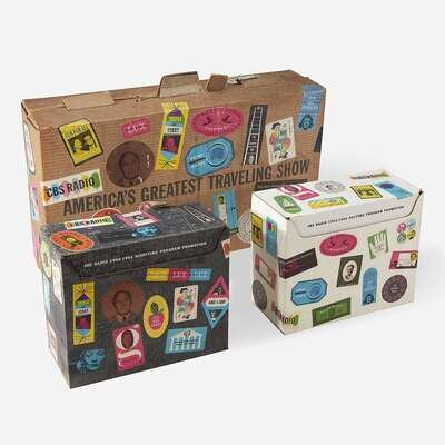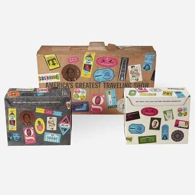 Original CBS Radio promotional advertising kit for their 1953-54 day and nightime program lineup. Comprising two printed paper boxes (each: 10 x 5 1/2 x 5 3/4 in.; 254 x 139 x 146 mm), containing 36 yellow printed folders for daytime programming, and 30 blue printed folders for nighttime programming, each folder contains numerous printed materials related to each show; housed in original decorated corrugated cardboard carrying box (15 x 16 x 7 in.; 381 x 406 x 177 mm); all in the style of suitcases, all packaging and content designed by Dorfsman.