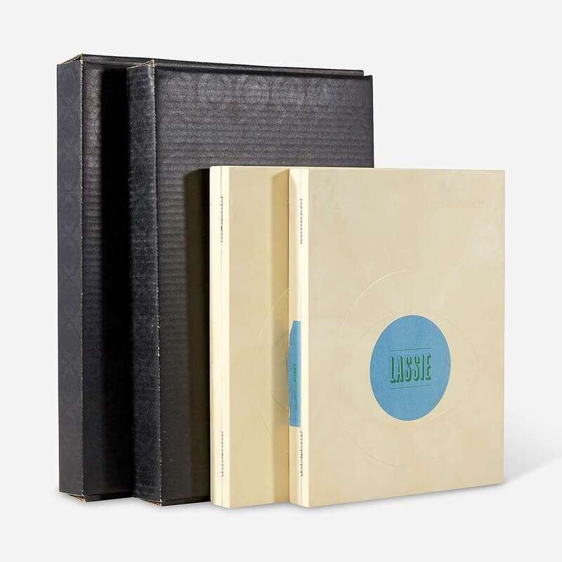 Circa 1960. Promotional box for the television show "Lassie". One 4to plastic box, with embossed CBS lettering and logo at center, printed paper label to same. Containing two paper folders, containing printed program notes, glossy photographs, credits and contact page, transcript of audio copy for trailers, copy for display, two rolls of films, slides, and other printed materials and ephemera for the show; in original CBS logo-patterned cardboard box. Includes similiar promotional box for the "Tom Ewell Show", ca. 1960.