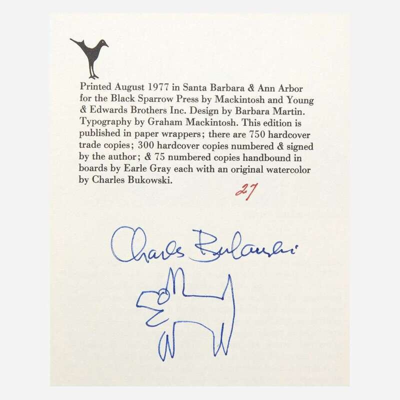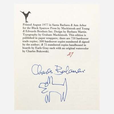 Santa Barbara: Black Sparrow Press, 1977. First and limited edition, #27/300 copies signed and numbered by Bukowski, with an additional doodle, by him, of a dog beneath his signature. 8vo. 307 pp. Original quarter purple cloth over tan boards, stamped in various colors; all edges trimmed; blue endpapers.