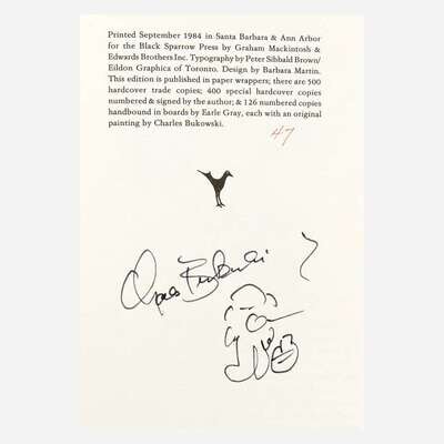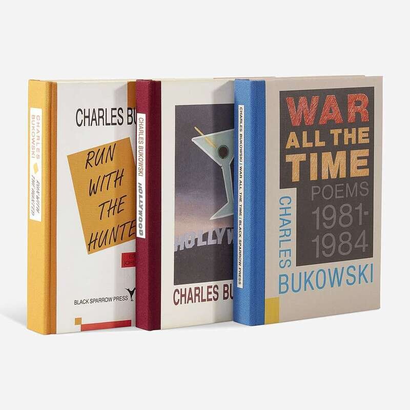 War All the Time, Poems 1981-1984 Santa Barbara: Black Sparrow Press, 1984. First and limited edition, #47/400 copies, signed and numbered by Buwowski, with an additional doodle, by him, of a person with a drink, below signature. Original quarter blue cloth over tan boards, stamped in various colors; all edges trimmed; orange endpapers. Together with: Hollywood Santa Rosa: Black Sparrow Press, 1989. First and limited edition, #384/500 copies, signed and numbered by Bukowski. Original quarter plum cloth over white illustrated boards; all edges trimmed; lilac endpapers. Together with: Run With the Hunted: A Charles Bukowski Reader (New York): HarperCollins, (1993). First and limited edition, #9/326 numbered and lettered copies, signed by Bukowski, with an additional doodle, by him, of a person with a drink. Original quarter orange cloth over white boards, stamped in orange, red, and black; all edges trimmed.