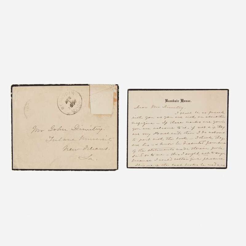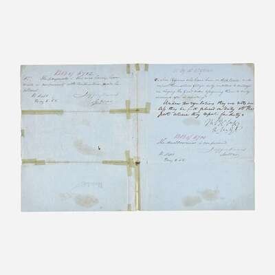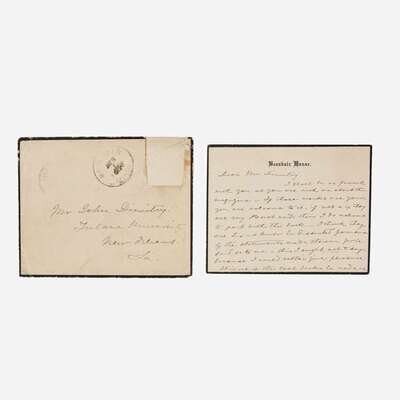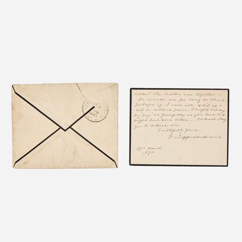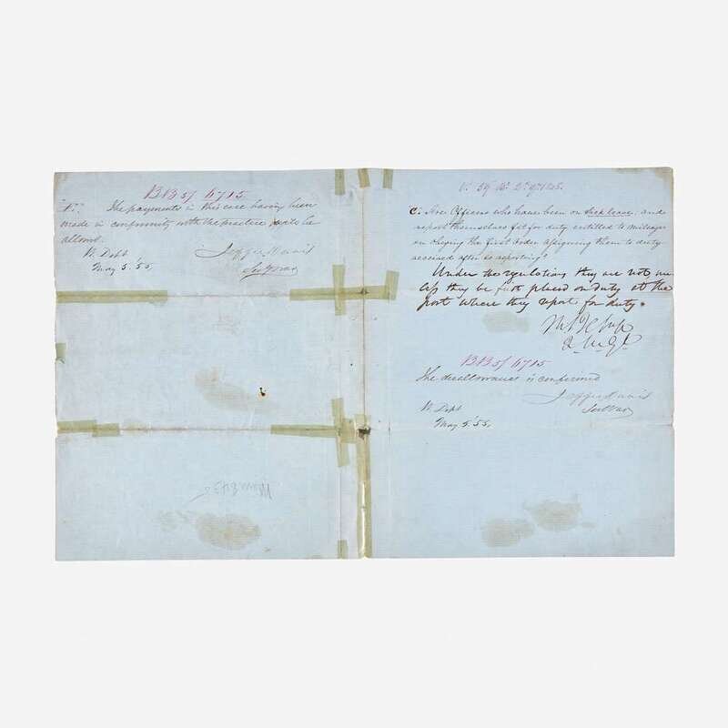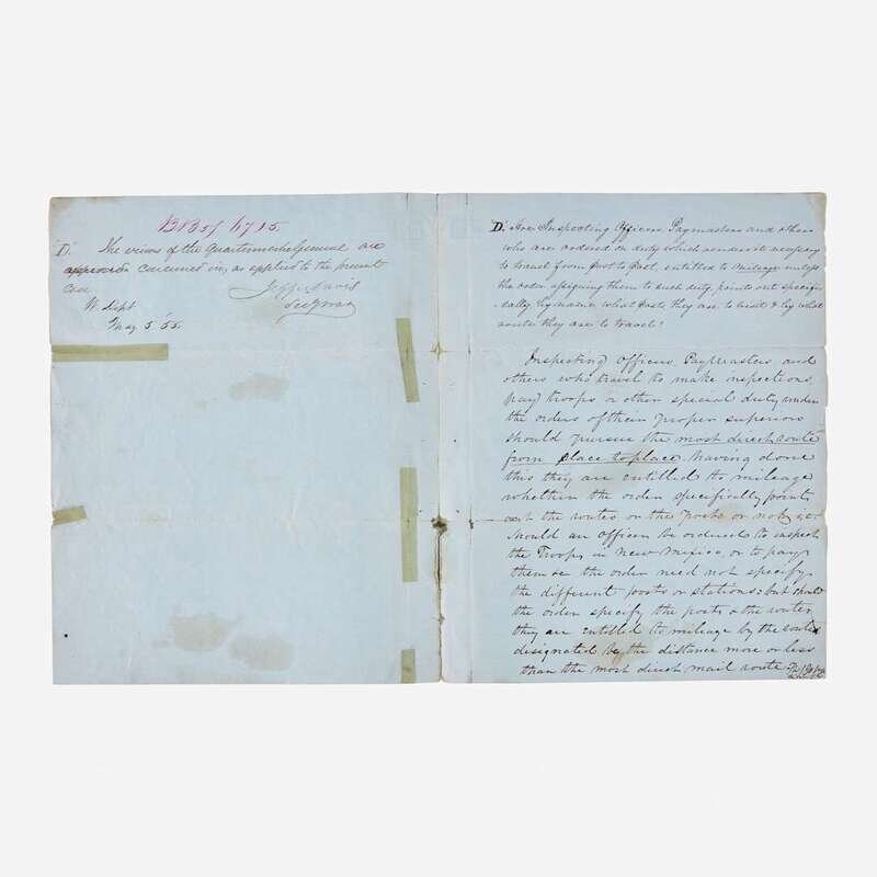 Davis, Jefferson No place, May 5, 1855. 4to. 4 pp. Autograph letter, signed three times by Davis, as Secretary of War, endorsing matters regarding payments and mileage reimbursements to officers, paymasters, and others, during the execution of their duties. Numerous sello tape repairs along original folds, scattered soiling. Together with: Davis, Varina (Biloxi, Mississippi), March 29, 1890. 16mo. 2 pp. Autograph letter, signed by Varina Davis, on Beauvoir Estate mourning stationery (her husband, Jefferson Davis, had died a little over three months earlier), to John Divinity of Tulane Univeristy, regarding a book that belonged to her late husband, Jefferson Davis: "I shall be as frank with you as you are with me about the magazine--if those marks are yours you are welcome to it, if not & if they are my husband's then I do not want to part with the book...This is one of the last books he read & we talked the matter over together..." With original postal envelope; scattered minor soiling.