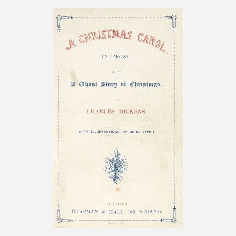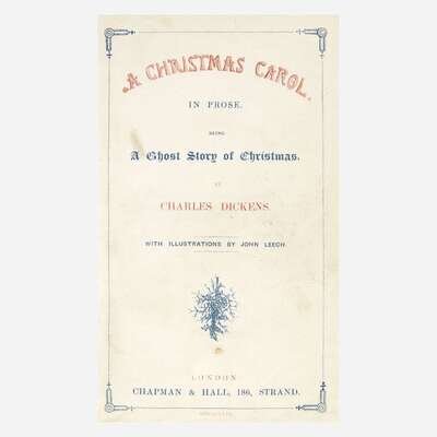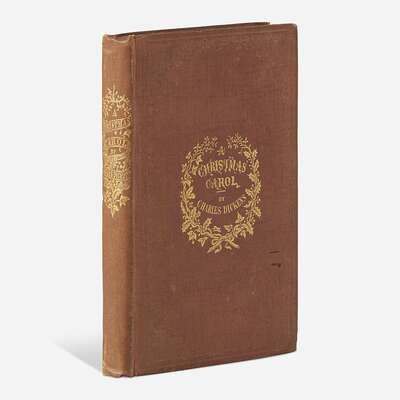 London: Chapman & Hall, 1843. First edition, first printing (Todd's earliest issue; with red and blue title-page, green endpapers, half-title and verso of title-page in blue, "Stave I" on first page, 14-15 mm between gilt and blind stamp on front board, unbroken gilt "D" in Dickens on same, and unrevised text). 8vo. (viii), 166, (2) (ads) pp. Illustrated with hand-colored engraved frontispiece, three hand-colored engraved plates, and four black and white in-text engravings, by John Leech. Original brown cloth, stamped in blind and in gilt, two small stains on front board, lightly worn; all edges gilt; green endpapers faded; contemporary ownership signature at head of half-title; soiling to frontispiece and title-page; scattered minor spotting to text and plates; top corner of pp. 59-64 variously creased; front and rear hinge lightly worn; a few scattered check marks and underlinings in pencil; cocked; in red morocco solander box. Smith II: 4; Eckel pp. 110-115.