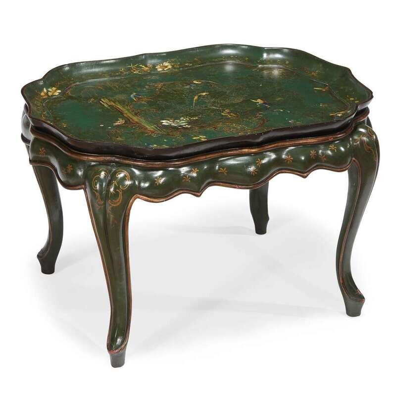 English green-painted and lacquered papier-mâché tray on stand 19th century