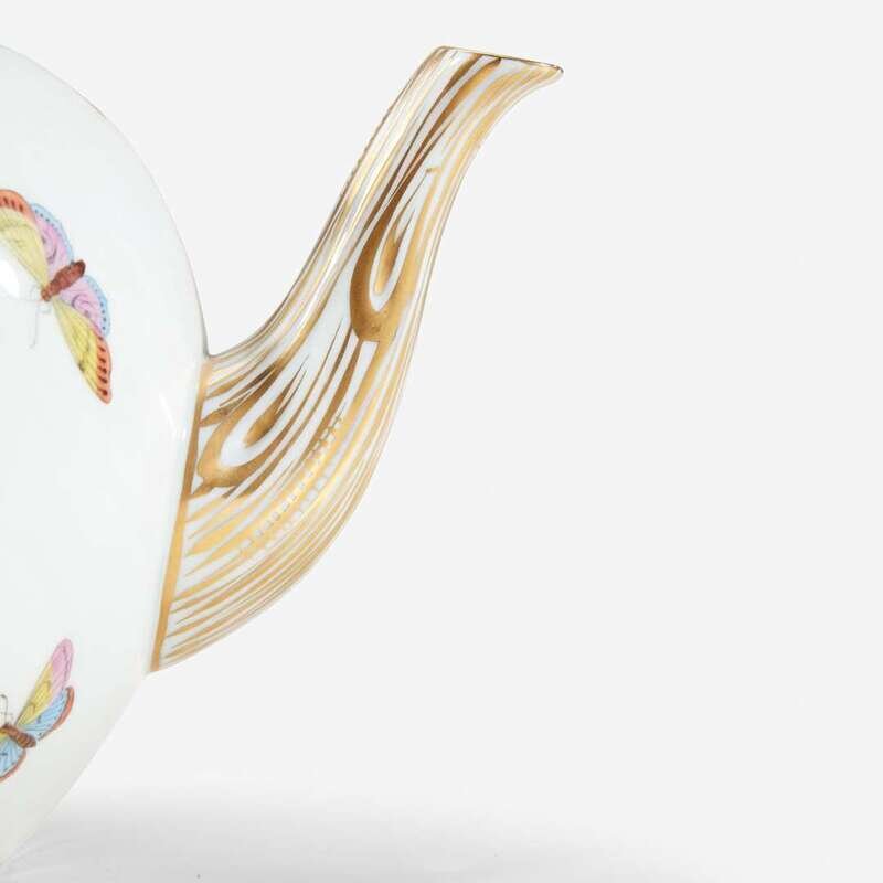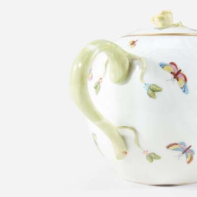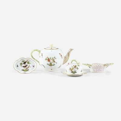 Comprising a teapot, a reticulated basket, a covered butter dish, and a shallow dish; all marked.