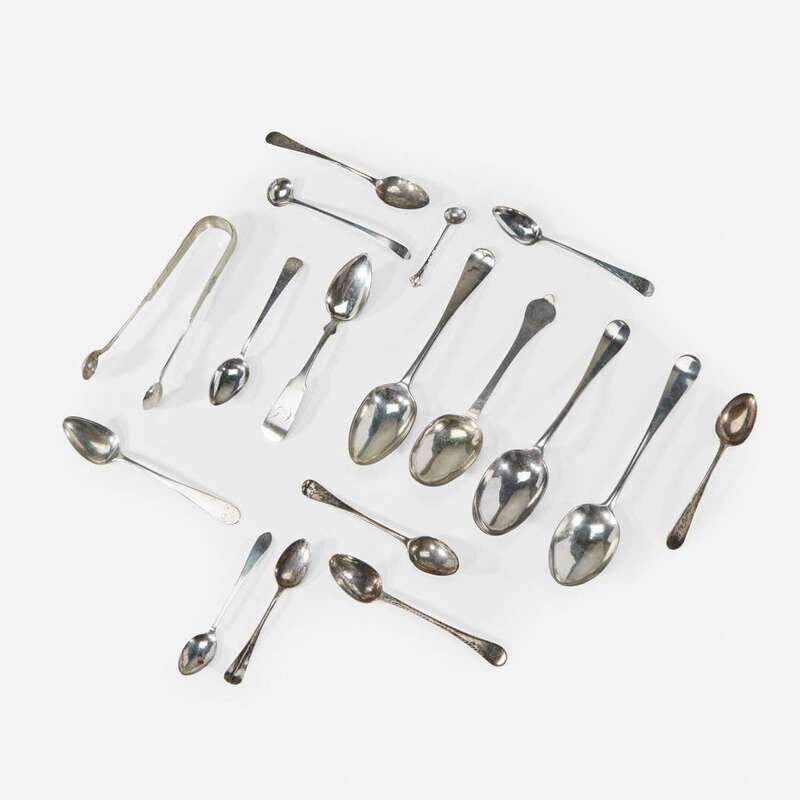 Comprising an early trifid terminus table spoon with rattail and initials "TS," table spoon and two brightcut teaspoons with the mark of William Holmes (1716-1783) Boston, a bird-back teaspoon with mark of George C. Dowig, Baltimore, a plume-back table spoon with mark of Joseph Loring, Boston, another tablespoon marked, I H" either Jacob Hurd or John S. Hutton, an American shell-back teaspoon, a flower-back teaspoon with mark of John Reynolds, Hagerstown, Maryland, a bright-cut teaspoon with mark of Isaac Hutton, Albany N.Y., a teaspoon with mark of Joseph Bruff, Easton, Md., a teaspoon with the mark of Daniel van Voorhis and Gerrit Schank, New York, a small ladle with mark of Joseph Moutlon (1744-1816) Newburyport, MA,, a teaspoon with the mark of John Patterson, Annapolios, MD, dated, "1765," a teaspoon with mark of Benjamin SwanAugusta, Maine, a salt spoon with mark of John Gray, Boston, New London, and sugar tongs with shell-back bowls marked, "Wells." (17).