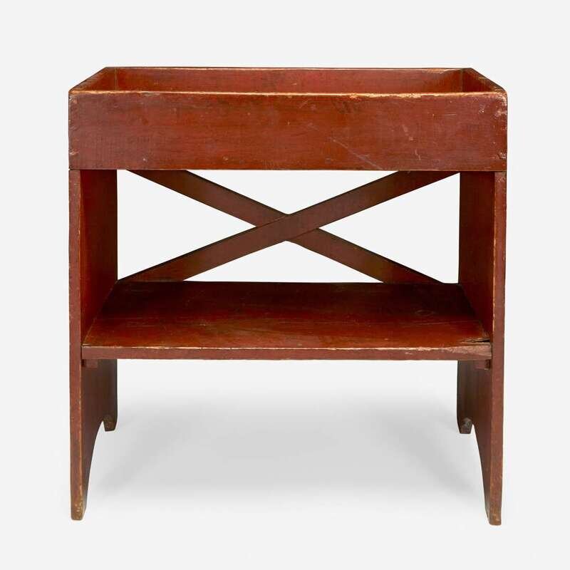 A red-painted pine bucket bench Pennsylvania, 19th century