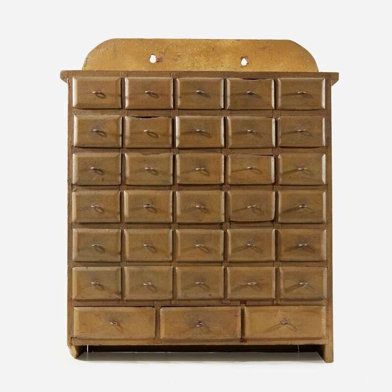 Green-painted wall cupboard fitted with thirty-three drawers 19th century