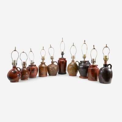 Group of ten redware jars and jugs fitted as lamps 19th century and later