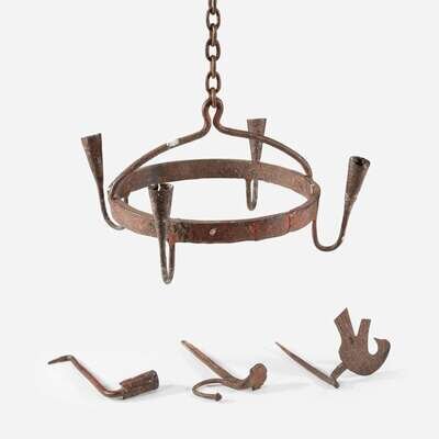 Wrought iron hanging candelabra and three betty hooks 18th/19th century