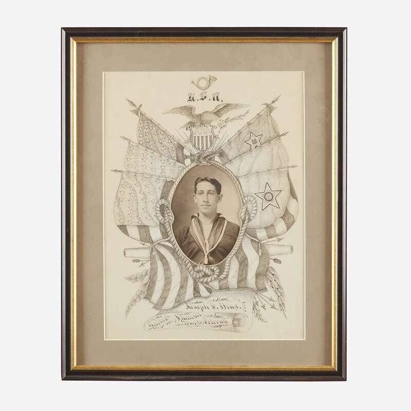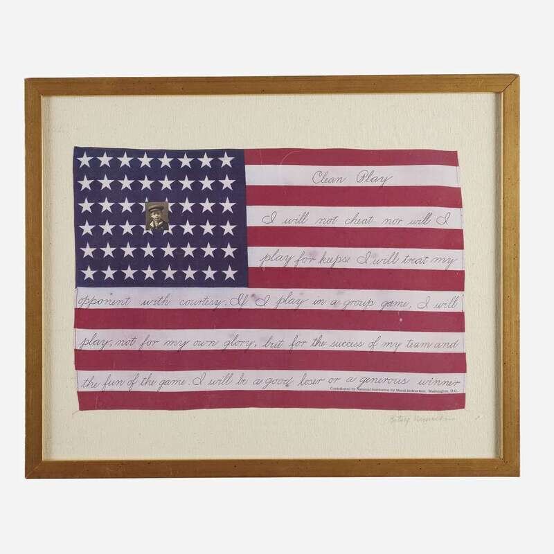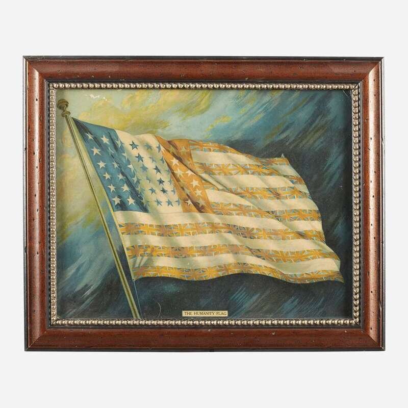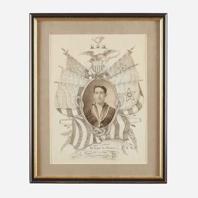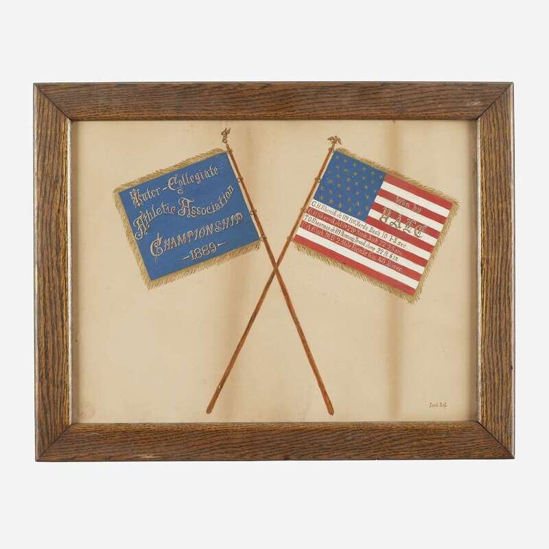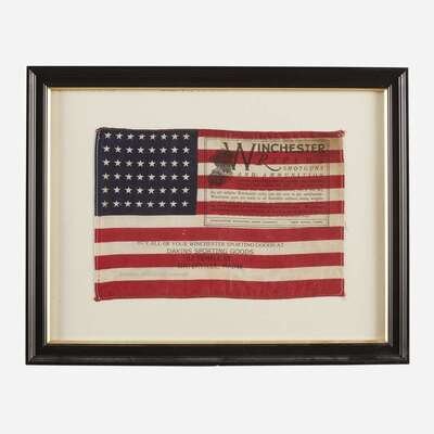 Comprising a calligraphic memorial sketch for a U.S.N. sailor, with a handrawn mat surrounding a photograph of Joseph V. Dins, inscribed "U.S.N./ Joseph V. Dins/ United Spanish War Veteran", a painted Inter-Collegiate Athletic Association Championship award, dated "1889" and inscribed "Won by DALE" along with the various individuals and their athletic event; a print of the Humanity Flag; a 48-Star American flag printed with the Winchester Rifles logo and slogan as well as a Dakins Sporting Goods, Waterville, ME advertisement, late 20th century; and a reproduction "Clean Play" 48-Star American Flag with a photograph of child mounted to canton, signed to mat, l.r., late 20th/21st century; all framed.