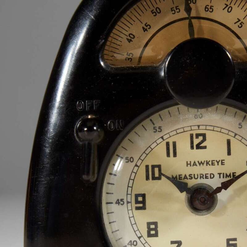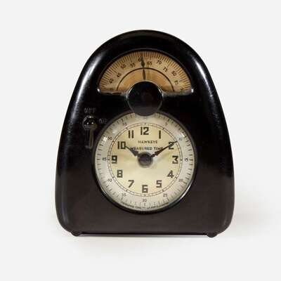 Bakelite, glass, acrylic, printed paper, metal The face marked: "Hawkeye Measured Time", "Measured Time Inc. La Porte, Indiana" Back with applied metal tag: "Measured Time La Porte, Ind. Model-L Patents 1371781 1424092 1620455 1821628 1821629 Other Patents Pending"