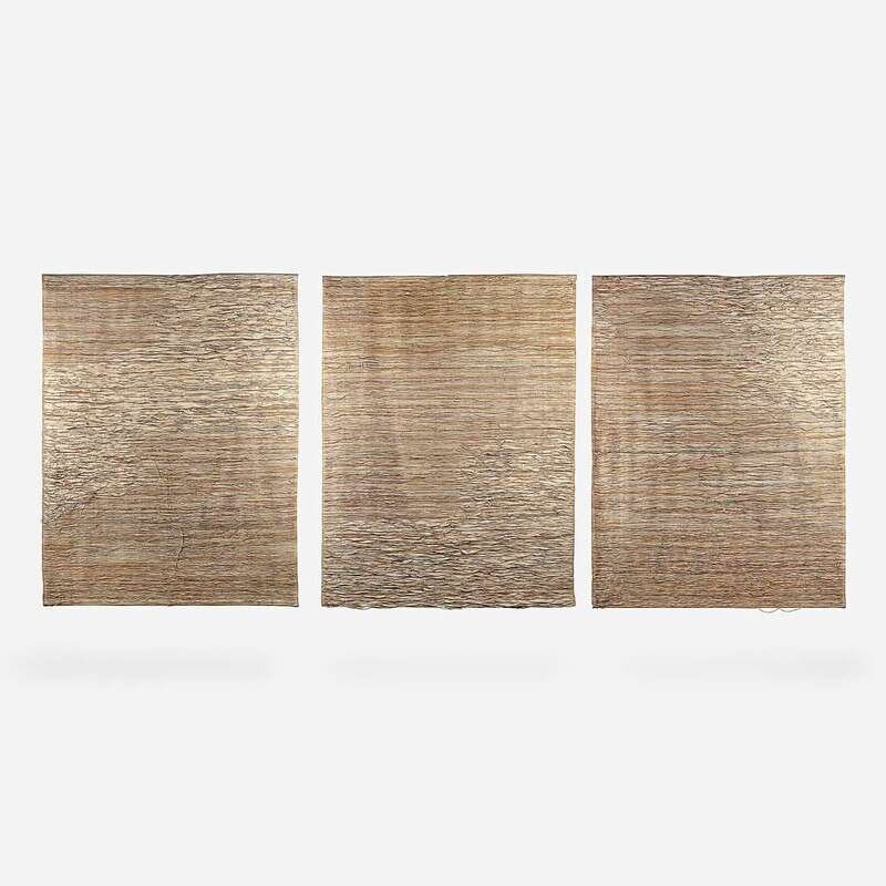 Signed, titled and dated 1981 at the bottom of the third panel verso, three panel tapestry mounted on steel rods.
