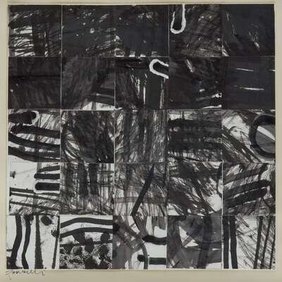 Each signed bottom right, signed, titled and dated 2013 on backing board verso, black ink on paper collaged squares.