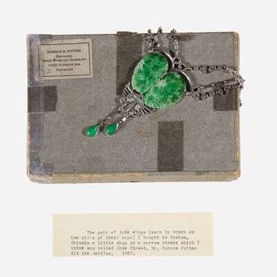 Original box with affixed paper label: "Horace E. Potter Designing Metal Work and Enameling 11437 Superior Ave. Cleveland", ink inscription to label: "#22" Loose, typewritten paper note enclosed reads: "The pair of jade wings (worn by women on the sides of their caps) I bought in Canton, China in a little shop on a narrow street which I think was called Jade Street. Mr. Horace Potter did the setting. 1907."