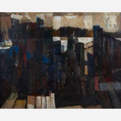 Signed top left, inscribed with title and dated 'summer 1956' verso, oil on panel.