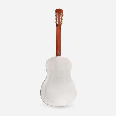 Nickel-plated body with rounded, V-shaped mahogany neck, rosewood fretboard with mother-of-pearl inlays and ivoroid binding Body with impressed serial number: "0282" and "PAT. PEND" Head with applied National shield decal Together with later black, chipboard case.