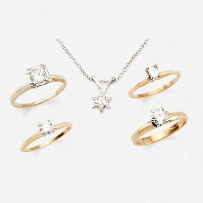 a round brilliant-cut diamond weighing approximately 0.60 carat in yellow gold; round brilliant-cut diamond weighing approximately 0.50 carat in white gold square mount; a round brilliant-cut diamond weighing approximately 0.40 carat in yellow gold; an emerald-cut diamond weighing approximately 0.25 carat in yellow gold; and an old European-cut diamond weighing approximately 0.25 carat set in a white gold pendant.