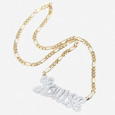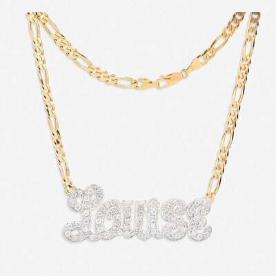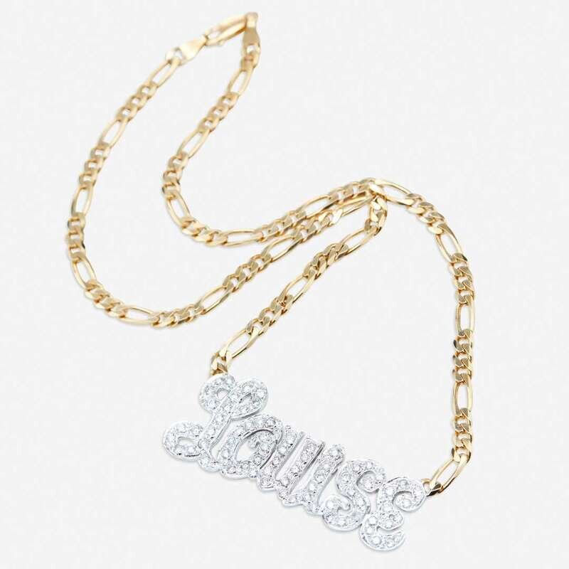 centering the name "Louise" set with round brilliant-cut diamonds; estimated total diamond weight: 2.00 carats, suspending from a figaro chain.