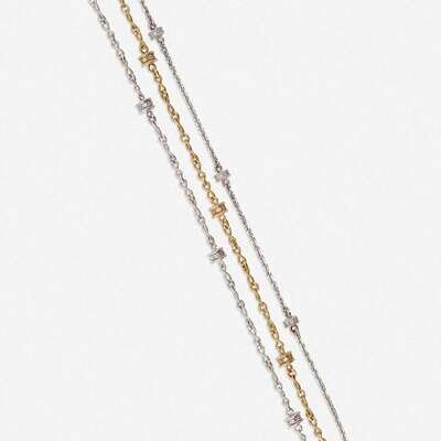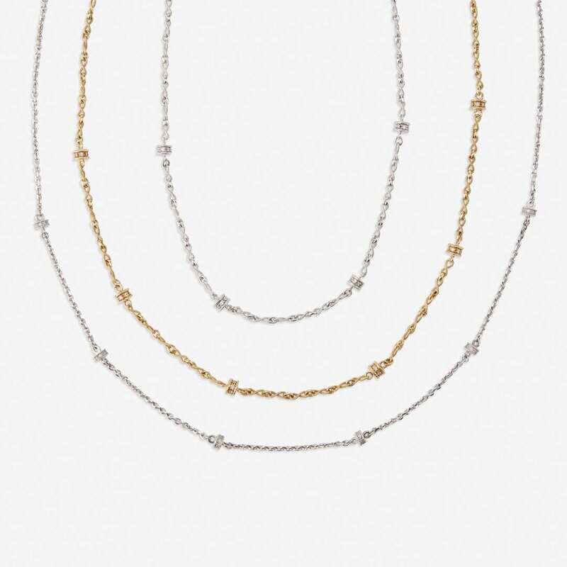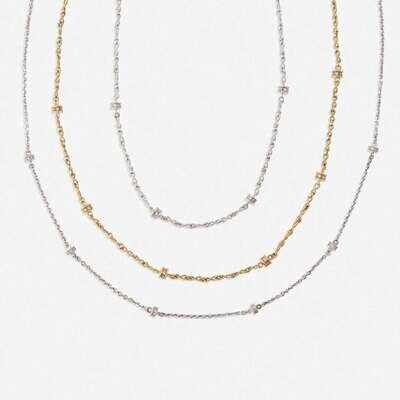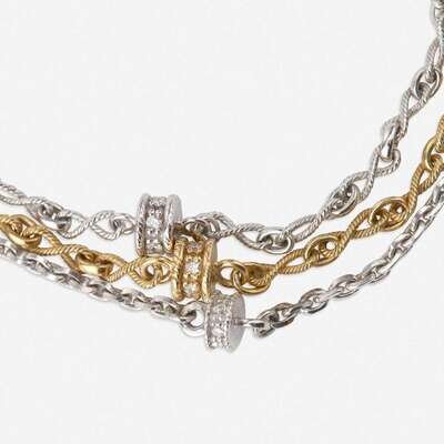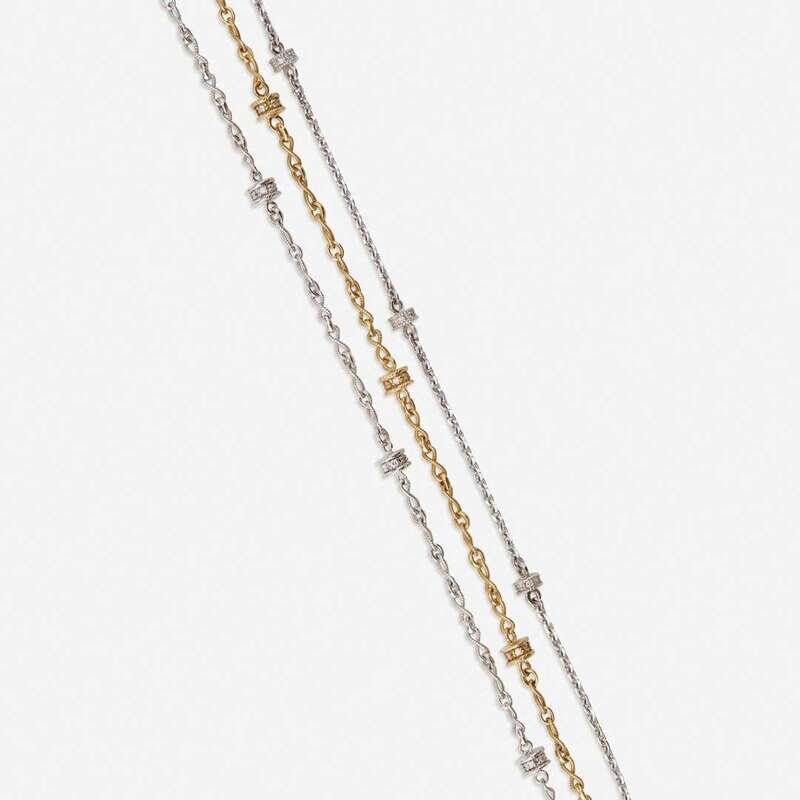 each designed as round brilliant-cut diamond rhondelles on a polished or roped gold chain.