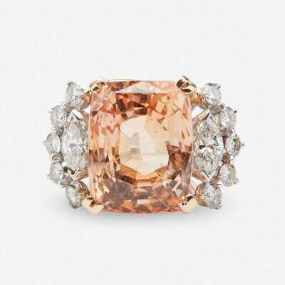 centering a cushion-cut light orange sapphire weighing approximately 19.00 carats, flanked by marquise and round brilliant-cut diamonds; estimated total diamond weight: 1.70 carats.
