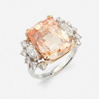 A light orange sapphire, diamond, and eighteen karat white gold ring