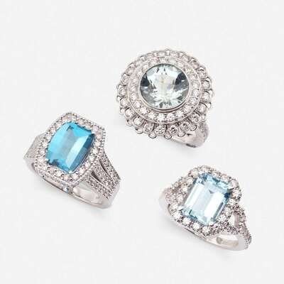including a platinum ring centering a circular-cut aquamarine weighing approximately 3.35 carats, surrounded by two rows of round brilliant-cut diamonds; an eighteen karat white gold ring centering an emerald-cut aquamarine weighing approximately 3.15 carats, surrounded and flanked by round brilliant-cut diamonds; and an eighteen karat white gold ring centering a cushion-cut blue topaz weighing approximately 3.00 carats, surrounded and flanked by round brilliant-cut diamonds; estimated total diamond weight: 3.25 carats.