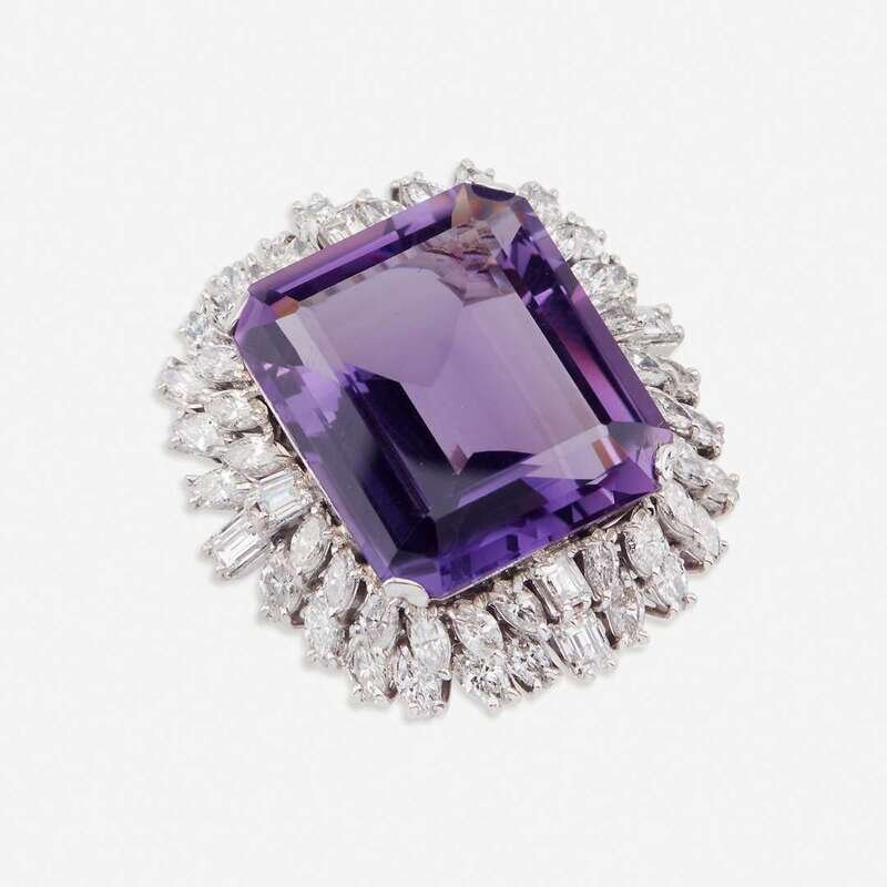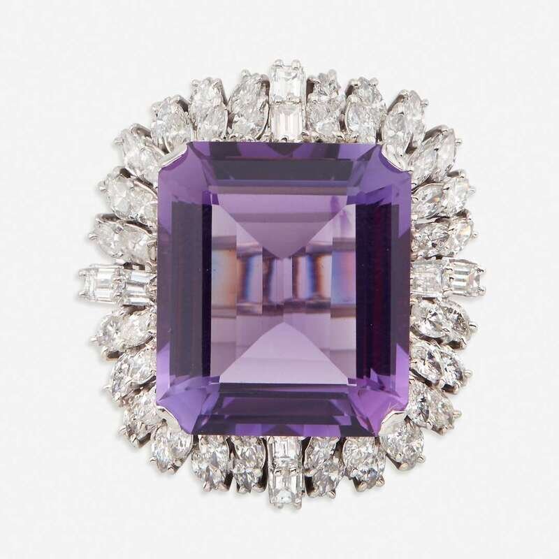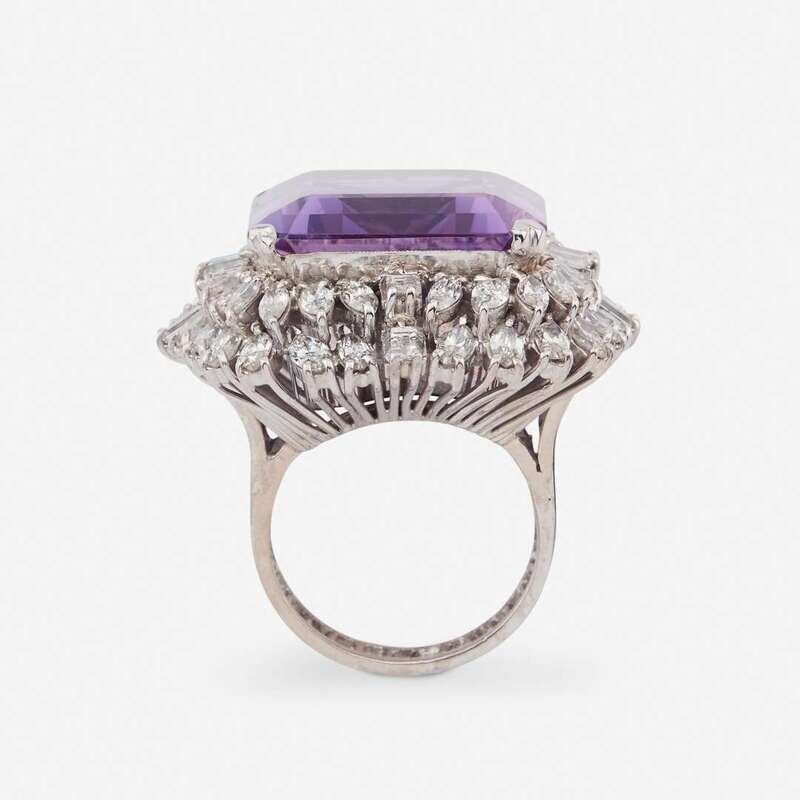 set with a large rectangular shaped amethyst measuring approximately 22.0mm x 19.5mm x 10.0mm, surrounded by two tiers of marquise and straight baguette-cut diamonds; estimated total diamond weight: 4.25 carats.
