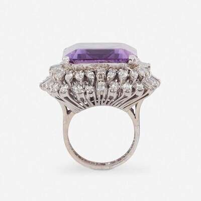 An amethyst, diamond, and fourteen karat white gold ring