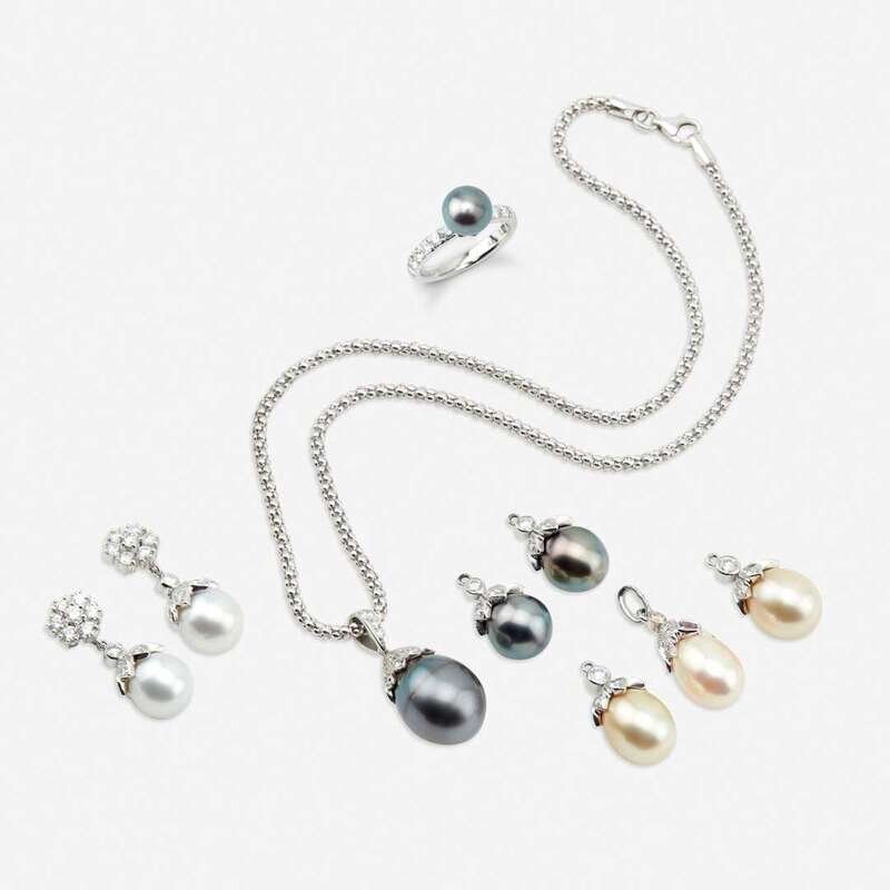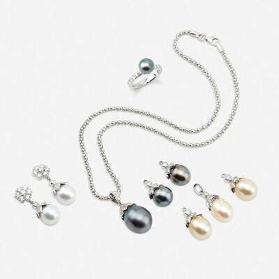including a pendant suspending a black cultured pearl measuring approximately 13mm x 17.5mm with a round brilliant-cut diamond set cap on fancy link chain; a pendant suspending a cultured pearl measuring approximately 9.5mm x 15.0mm with a round brilliant-cut diamond and circular-cut pink sapphire set cap on platinum chain; an eighteen karat white gold ring centering a black cultured pearl measuring approximately 8.3mm, flanked by round brilliant-cut diamonds; and a pair of platinum earrings designed as round brilliant-cut diamond clusters with three interchangable pendants suspending black, gold, or white cultured pearls with round brilliant-cut diamond set caps; estimated total diamond weight: 4.45 carats.