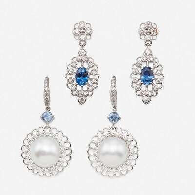 Two pairs of eighteen karat white gold, sapphire, diamond, and South Sea cultured pearl earrings