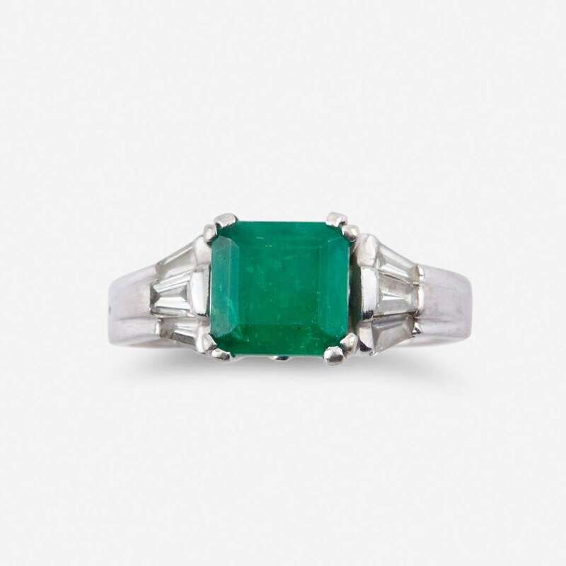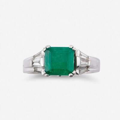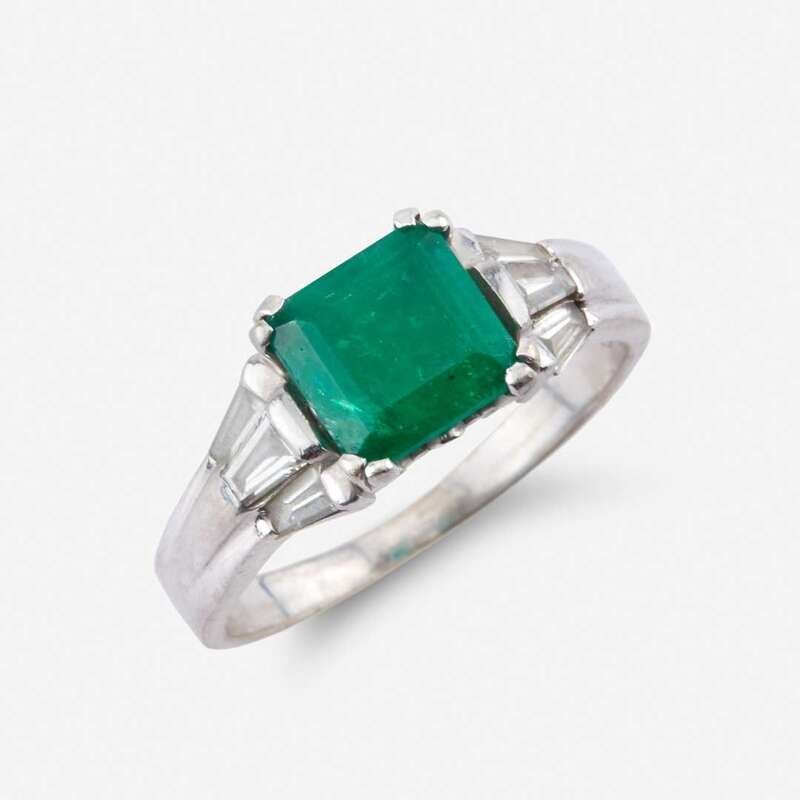 centering an emerald cut emerald weighing approximately 1.80 carats, flanked by three tapering baguettes on either side.