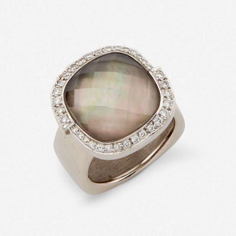 designed as a faceted quartz cushion, over mother-of-pearl, framed by round brilliant-cut diamonds.