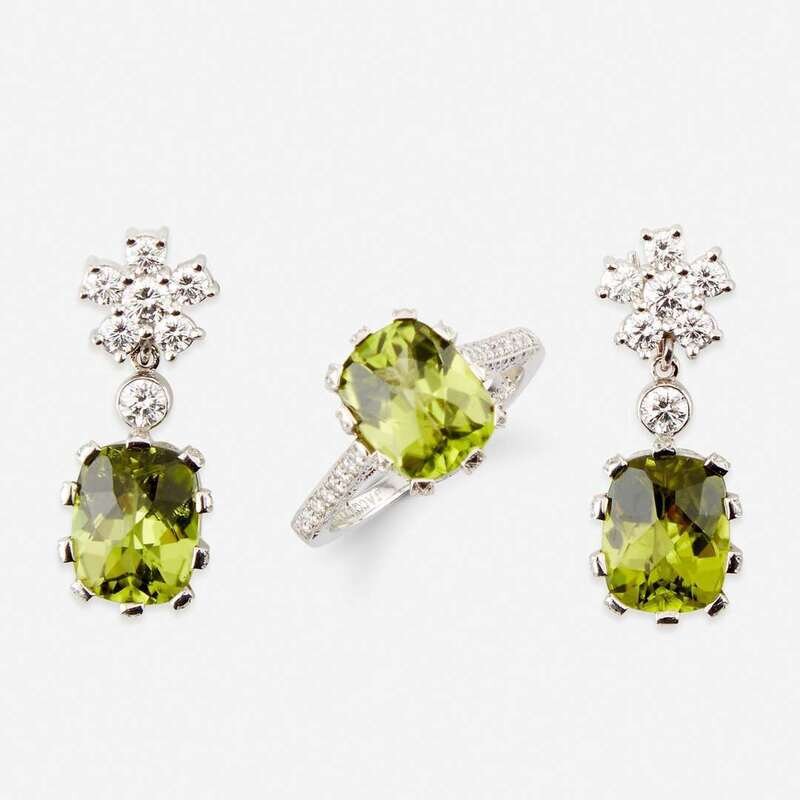 A pair of peridot, diamond, and platinum earrings with matching ring