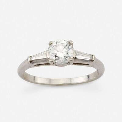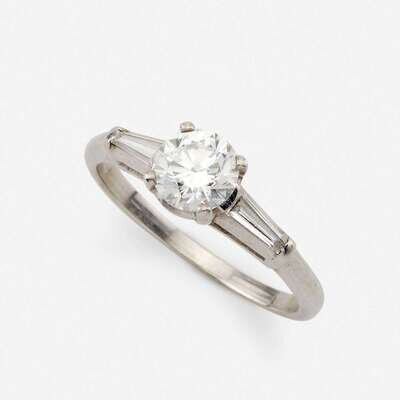 centering a round brilliant-cut diamond weighing approximately 0.80 carats, flanked by tapering baguettes, mounted in platinum.