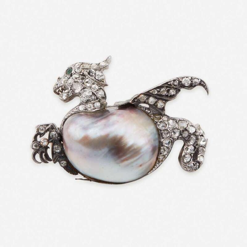 designed as a griffin set with rose-cut diamonds (some diamonds deficient), emerald eye, and blister pearl body measuring approximately 17.0mm x 22.0mm, set in a silver topped fourteen karat yellow gold mount.