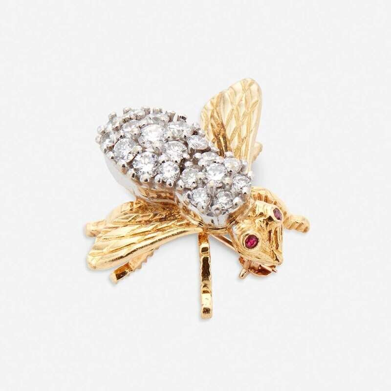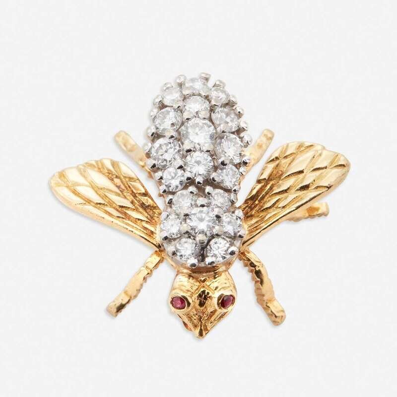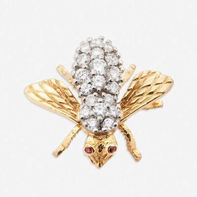 designed as a bumble bee with round brilliant-cut diamond body and ruby eyes; estimated total diamond weight: 0.50 carat.